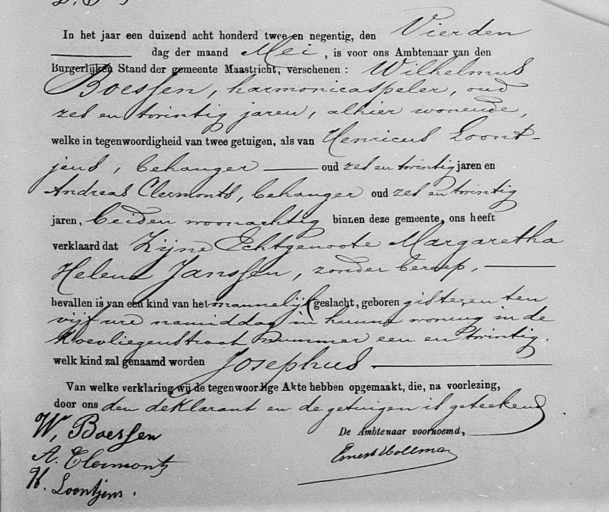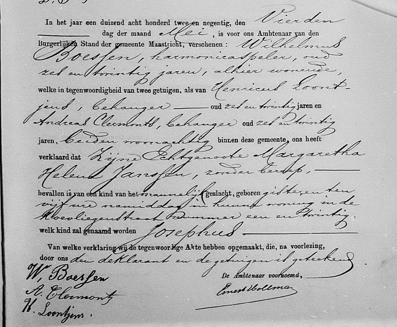 | Vader | Wilhelmus BoessenWilhelmus Boessen ![]() * 17-01-1866 Weert, Nederland † 24-10-1952 Maastricht (NL) ∞ Margaretha Helena Janssen, 13 kinderen |