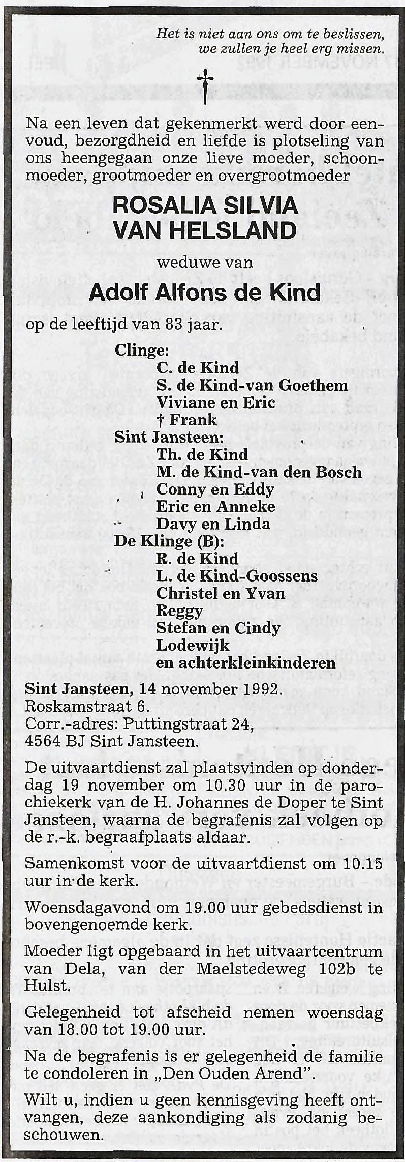 | Partner | Adolf Alfons de KindAdolf Alfons de Kind ![]() * 15-11-1908 Sint Jansteen, Nederland † 24-06-1982 Hulst, Nederland ∞ Rosalia Silvia (Rosalie) van Helsland, 04-08-1933, 1 kind |