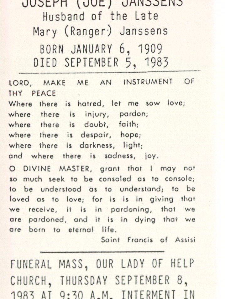 | Moeder | Adolphina BaertAdolphina Baert ![]() * 28-09-1872 Sint Jansteen, Nederland † 03-08-1937 Tillsonburg, Ontario, Canada ∞ Joannes Livinus Janssens, 02-03-1892 Koewacht, Nederland, 16 kinderen ∞ Petrus Segers, 23-04-1920 Sint Jansteen, Nederland |