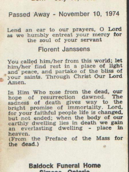 | Moeder | Adolphina BaertAdolphina Baert ![]() * 28-09-1872 Sint Jansteen, Nederland † 03-08-1937 Tillsonburg, Ontario, Canada ∞ Joannes Livinus Janssens, 02-03-1892 Koewacht, Nederland, 16 kinderen ∞ Petrus Segers, 23-04-1920 Sint Jansteen, Nederland |