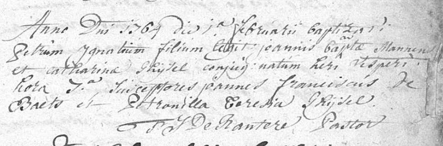 | Vader | Johannes Baptiste MannensJohannes Baptiste Mannens ![]() * ± 1730 Aalter, België † 27-06-1773 Adegem, Maldegem, België ∞ Catharina Gijsels, 02-05-1754 Adegem, Maldegem, België, 11 kinderen |