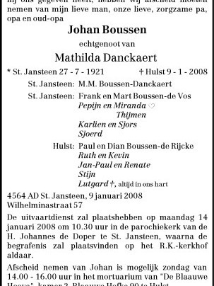 | Vader | Franciscus BoussenFranciscus Boussen ![]() * 30-12-1894 Sint Jansteen, Nederland † 26-02-1978 Hulst (NL) ∞ Maria Florentina van Puijenbroek, 28-11-1919 Sint Jansteen, Nederland, 1 kind |