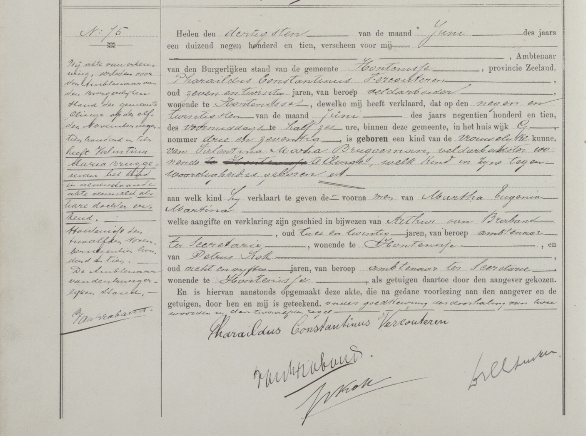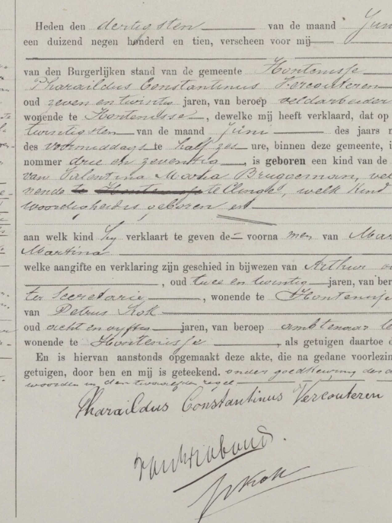 | Aangifte der geboorte gedaan door Pharaildus Constantinus Vercouteren, veldarbeider, 27 jaar, wonende te Hontenisse | |